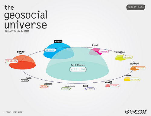 Hoy doble ración :) En este caso me pareció muy interesante y expresiva la siguiente Infografía acerca del Universo Geosocial, del número de usuarios de cada red social reflejando además la proporción de los mismos que acceden a través de la web o desde sus dispositivos móviles. Su autor, Jess3 es el mismo que firmaba, con Brian Solis, el Prisma conversacional, otra interesante infografía.