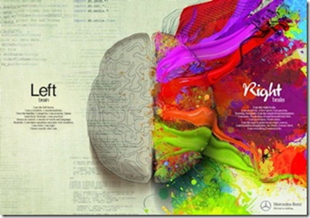 Me llamaba la atencíón la imagen. Se trata de un anuncio de Mercedes que expresa bien las diferencias entre las formas de pensar de los hemisferios en los que se divide nuestro cerebro. El texto también resulta interesante: